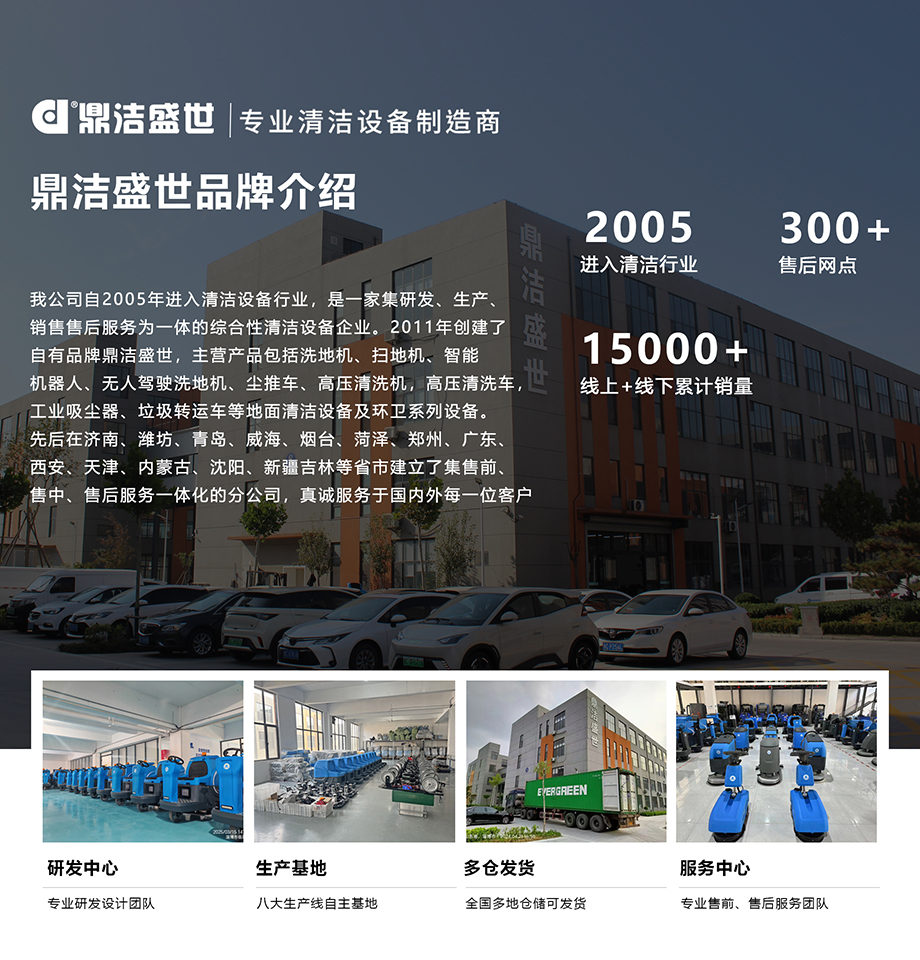 鼎潔盛世是一家集研發、生產、銷售、售后服務為一體的綜合性清潔環保設備公司。鼎潔盛世品牌下的主營產品包括洗地機、掃地機、塵推車、工業吸塵器、無人駕駛洗地機、高壓清洗機高壓沖洗車等地面清潔設備及環衛系列設備。