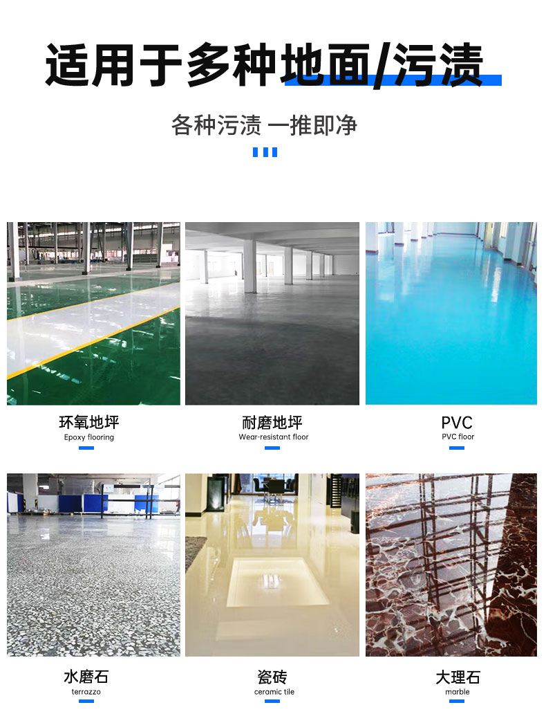 適用場所:水磨石、大理石、花崗石、人造石、地磚、PVC、精鋼沙、環氧等硬質表面的清潔。更是機場候機樓、火車站、大型商場、工廠車間、學校、醫院、地下車庫、大型物流倉庫等場所保潔的共同選擇。