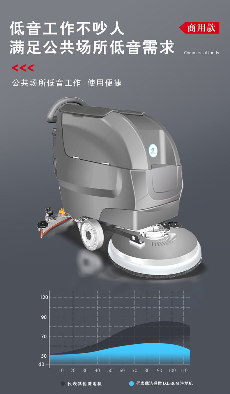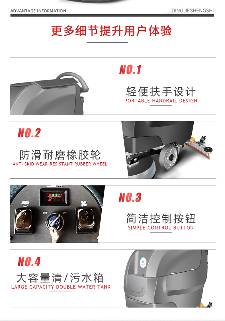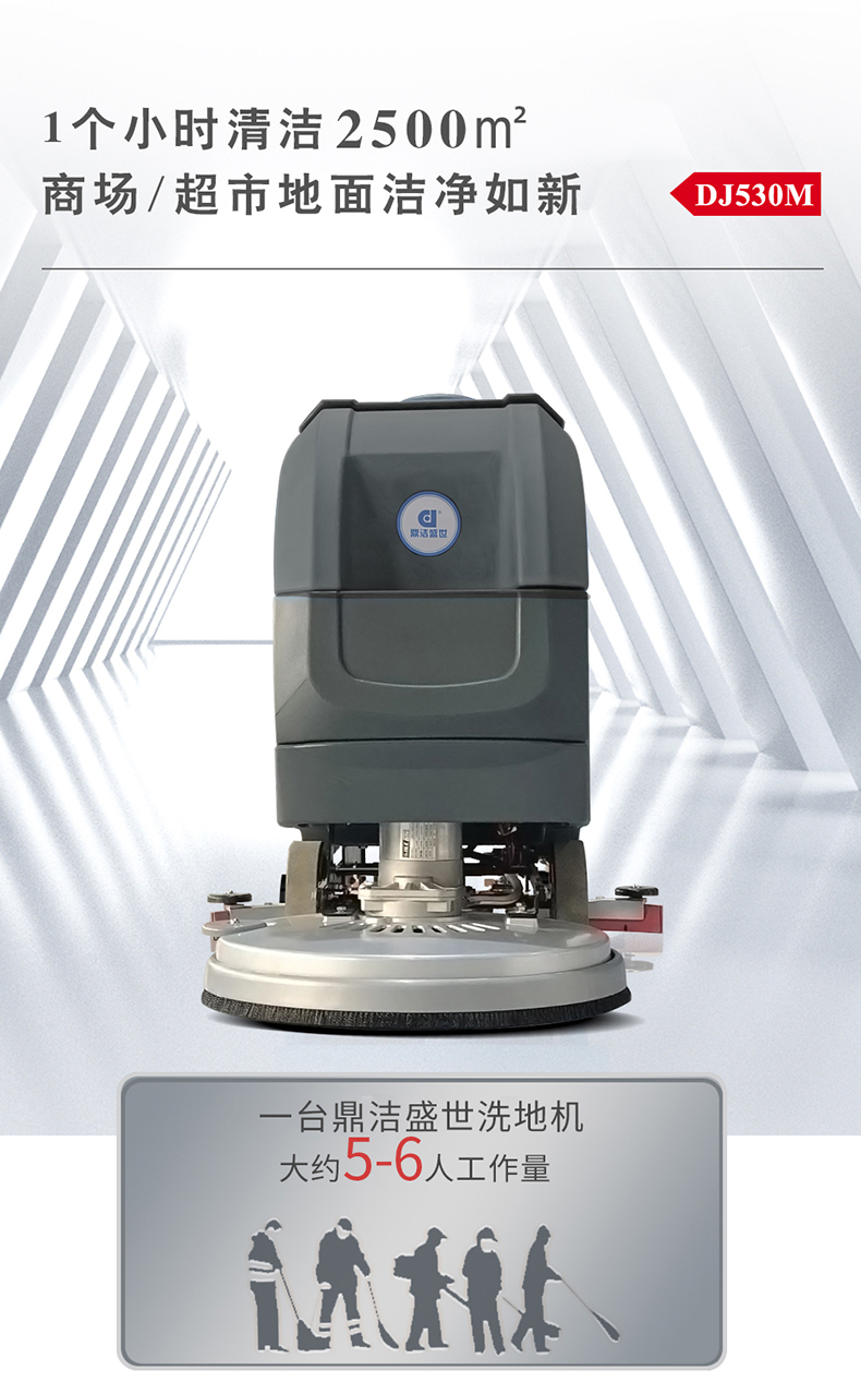 駕駛式洗地機怎么選擇?1 清潔效率:優先選擇每小時清潔面積&ge;2000㎡、續航&ge;4小時的機型,如鼎潔盛世DJ530M(2700㎡ h,續航5小時)。