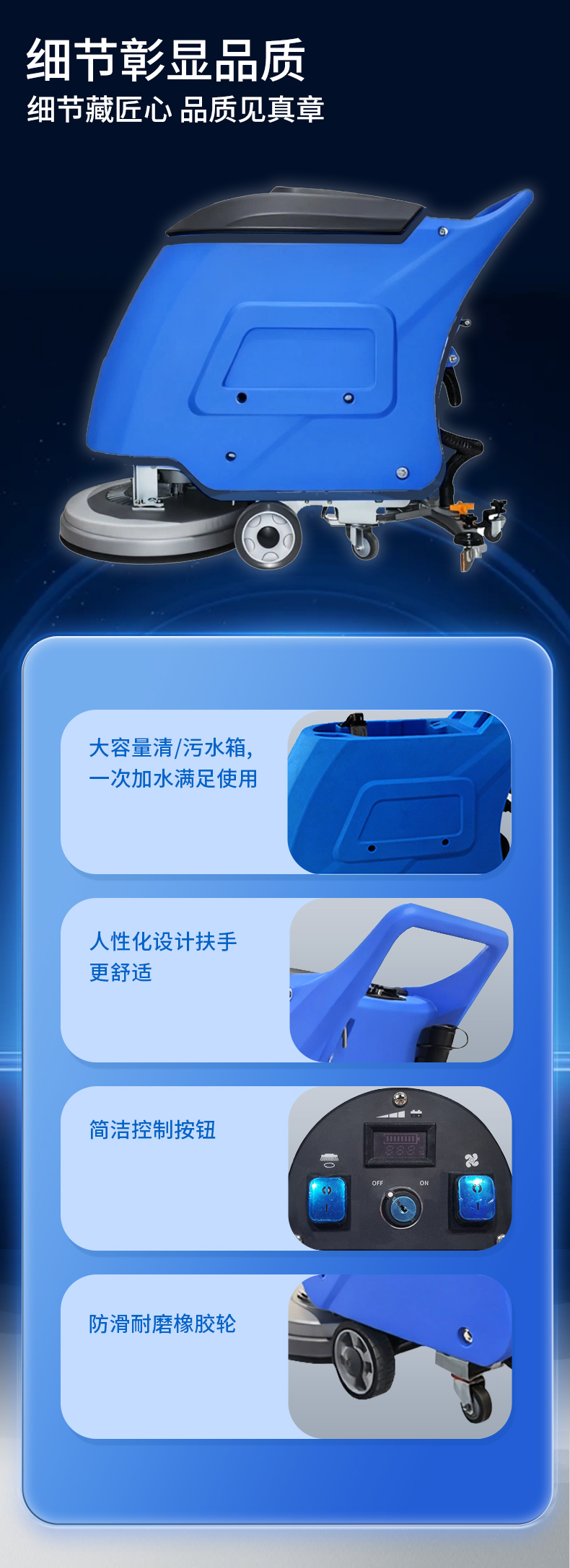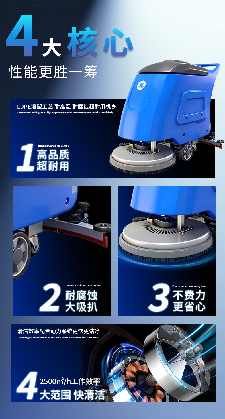適用場所:商場超市、工廠車間、辦公樓、機場車站、地鐵站、學校、醫院、酒店、停車場、倉儲倉庫、展廳等場所使用。清洗過的地面整潔干凈,沒有水漬殘留。